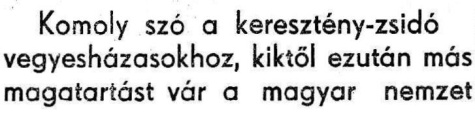 Zsidó barátaiktól nem tudtak elválni, de most ezen a kérdésen segített a gettó. Nincs többé tea, bridzs, vacsora, melyen zsidó is részt vesz. A zsidó előtt kora délután bezáródik a gettó ajtaja. Ha a vegyesházasok a társadalom szélesebb köreiben, vagy bizonyos hivatali állásokban ezután is érezni fogják, hogy a magyar társadalom minden tagja nem tud velük összemelegedni, viseljék el ezt, mint áldozatot gyermekeikért és viseljék zúgolódás nélkül, viseljék hálásan a magyar nemzet iránt, mely nagy ajándékot adott nekik. Igen rövid szavakkal megmondható, mit vár tőlük a magyar társadalom: Legyenek becsületesen magyarok és gyermekeiket neveljék kereszténynek és magyarnak. Ha nem így lesz, az ő sorsuk is beteljesedik. Ezer szem és ezer fül figyeli őket!