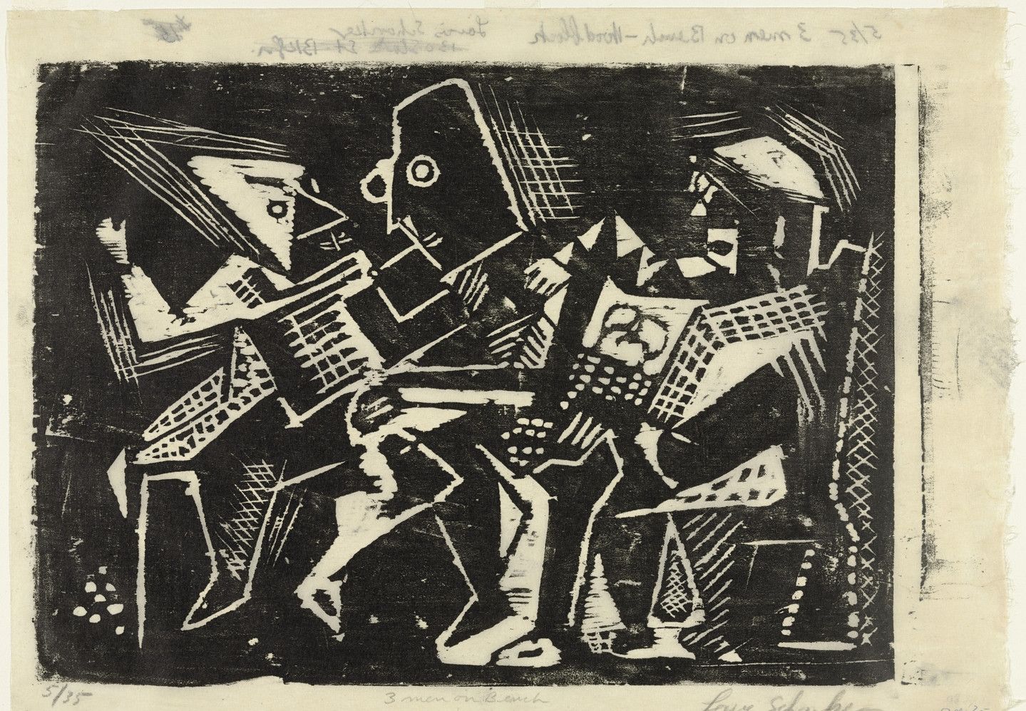 ![]() Három férfi egy padon (Louis Schanker, 1939), egy absztrakt alkotás a Rothko-féle The Ten csoport egyik zsidó tagjától (forrás: moma.org) |