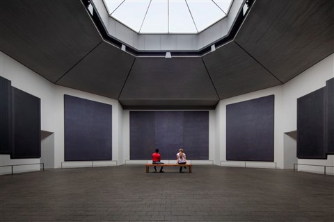 ![]() A megfigyelő „részt vehet” a műalkotásban: Mark Rothko alkotásai a Rothko Kápolnában (Houston, Texas), amelyek szinte teljes egészében feketére festett vásznak (forrás: texashighways.com) |