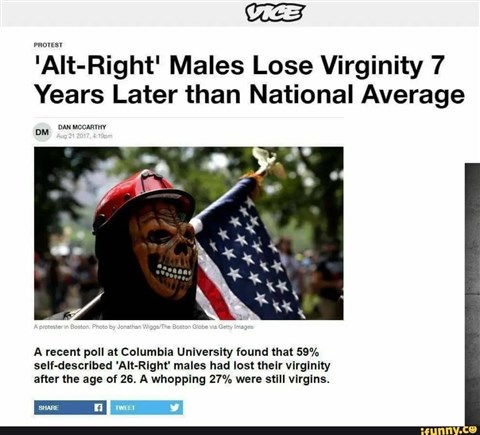 ![]() Az amerikai "szélsőjobbos" fiúk 59 százaléka 26 éves kora után, vagyis 7 évvel később veszíti el a szüzességét, mint az országos átlag, és a 27 százalékuk még szűz |