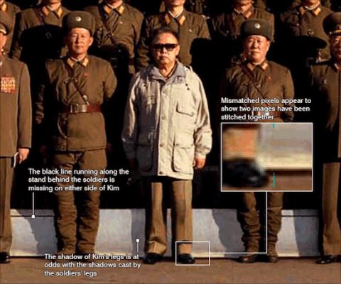 ![]() 2008: A nyugati média kérdőjelezte meg a Kim Jong-Il-ről készült fotó valódiságát. A közeli képen látható, hogy nem passzol az árnyék, de más problémák is vannak a képpel. Egyelőre nem nyilvánították hamisnak a felvételt. |