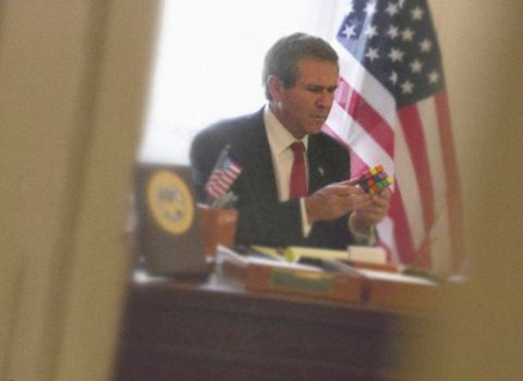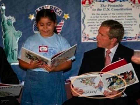 ![]() 2002: Geourge W. Bush-ból nem ritkán próbáltak hülyét csinálni, a kép eredetijén nem tartja fejjel lefelé a könyvet. |
