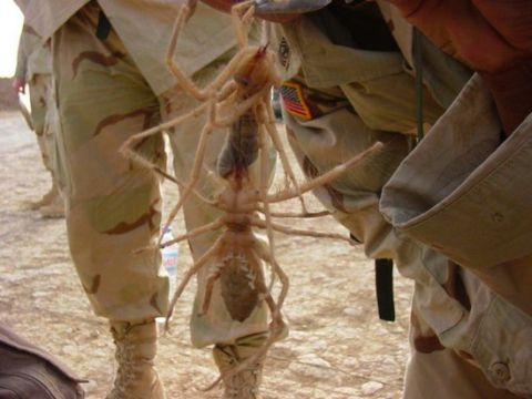 ![]() 2004: Az Irakból származó, tevepókokat bemutató fotó valódi (bár kicsit torzít a kamera), de teljesen fals szöveggel járta be az Internetet. Tényleg élnek ilyen óriás pókok a sivatagban, de nem esznek embert és nem halálos a csípésük. |