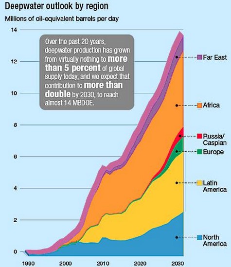 A következő képen pedig a mélyvízi (1 kilométernél mélyebb víz alatt található) olajtermelés felfejlődése látható, ami azért érdekes, mert a '90-es években kezdődött, amikor nagyon alacsony volt az olajár, így tisztán a technológia árának csökkenése révén vált megvalósíthatóvá, bár értelemszerűen a 2000-es években emelkedő árak lökést adtak a folyamatnak. Az ábra kiváló példája annak, hogy az egyes fosszilisforrások kitermelését rövid távon az áringadozás (amit legjobban a 2009-es törés mutat), hosszú távon a technológia fejlődése vezérli. A mélyvízi technológiában emellett nagy tartalékok is vannak még, mivel a világ magasabb valószínű tenger alatti olajlelőhelyeit nagyrészt még nem kutatták, főleg a Sarkvidéken, az Afrikai és Dél-Amerikai partok előtt:
